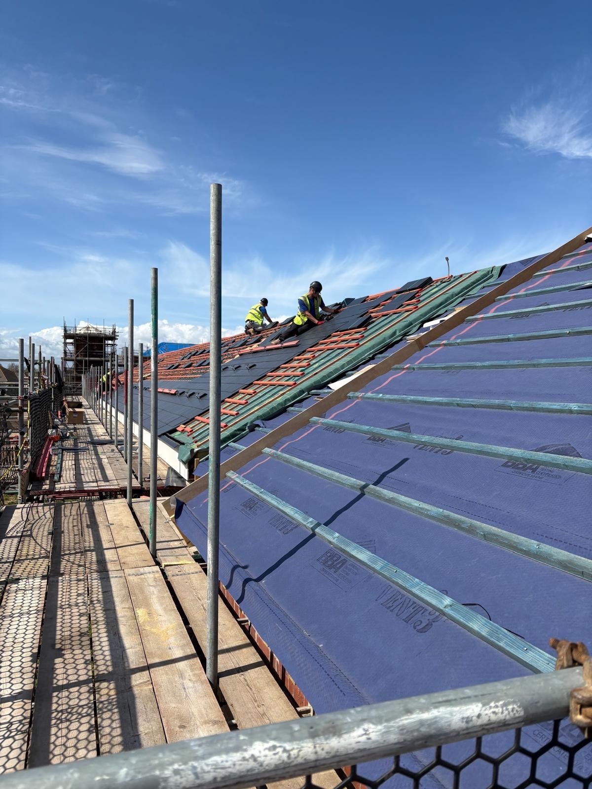 We are also installing 2,000m² of Bauder build-up felt systems across flat roof areas to provide long-lasting waterproofing. Throughout the project, careful integration of roofing details is key to preserving the building’s architectural heritage while enhancing its thermal and fire performance.